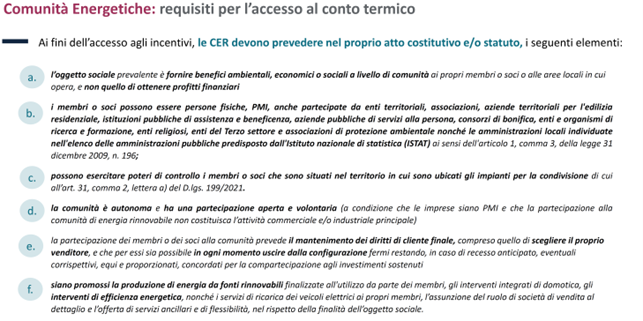Oltre ai requisiti di legge indicati nel DM CACER 414/2023, nel proprio atto costitutivo e/o statuto, le CER dovranno avere incluso la previsione esplicita relativa alla possibilità di realizzare interventi di efficienza energetica per i propri soci o membri. Se ciò non fosse, le CER e i gruppi di autoconsumo già qualificate ai sensi del DM 414/2023, potranno provvedere ad integrarli secondo le modalità previste dalla legge e/o dai propri Regolamenti.