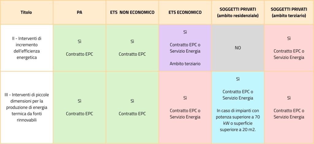 Occorre ricordare solo un’unica eccezione: nel caso in cui il Soggetto Ammesso è un privato che interviene in ambito residenziale, la ESCo potrà agire come Soggetto Responsabile solo quando l’intervento ha ad oggetto impianti con potenza superiore a 70 kW o superficie superiore a 20 m2.
